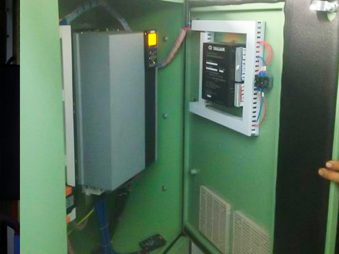 以上兩張圖片是我司在佛山某空壓機應用現場所拍,我司的技術工程師正在調試FC360變頻器??諌簷C變頻調速控制原理是電動機拖動空氣壓縮機旋轉,使之產生壓縮空氣,并存儲于儲氣罐中。儲氣罐中空氣壓力的大小取決于空氣壓縮機產生壓縮空氣的能力(本系統中即取決于電動機的轉速)和用戶用氣量之間的平衡狀況,為了保證供氣質量,要求儲氣罐空氣壓力穩定在某一數值上。儲氣罐內的壓力為被控量,壓力變送器將儲氣罐的壓力變換成電信號送給變頻器PID單元,與壓力給定值進行比較,PID能單元根據比較所得偏差的大小和方向按預定的 PID 運算規律運算后產生控制信號改變變頻器的輸出,從而改變電動機的轉速,使儲氣罐內的實際壓力始終維持在給定值上。