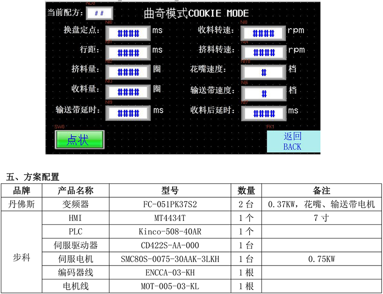 該設(shè)備只需在 HMI 上設(shè)定簡單參數(shù),無需更換設(shè)備即可生產(chǎn)多種外形的曲奇餅干。步科提供的 PLC+HMI+伺服產(chǎn)品,無論從性能、穩(wěn)定性,還是服務(wù)方面,都給客戶留下了深刻的印象