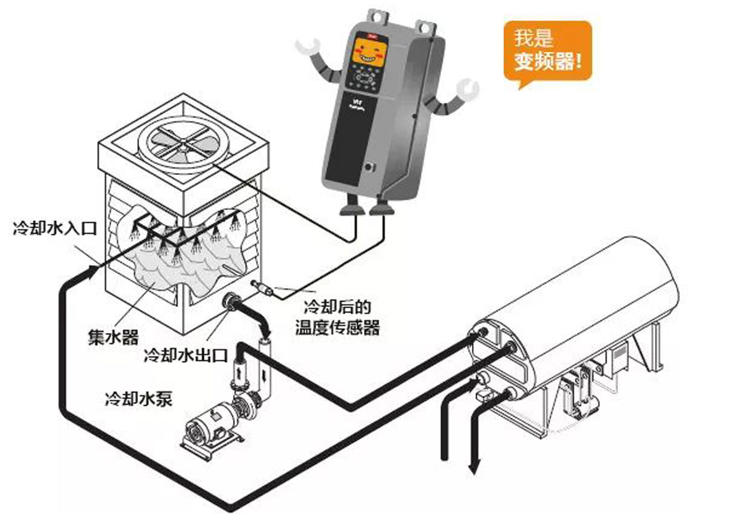 加入變頻器后,操作十分簡單,設定制冷機組所需要的冷卻水溫度、溫度傳感器必要參數,變頻器便可對冷卻塔的散熱風機轉速進行實時的動態控制啦~