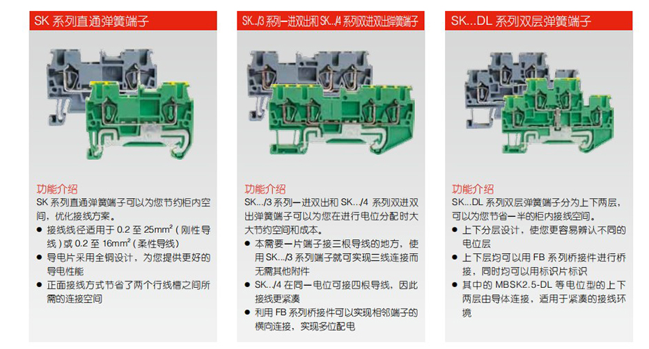 ● 先進的回拉式彈簧設計,保證足夠大的接觸面積和壓緊力● 拆卸安裝方便,節省安裝時間● 更好的抗振性能,適用于軌道、機械等振動較大場合● V0阻燃等級塑料,杜絕火災隱患● 100%鹽霧測試,防腐蝕,更長的使用壽命