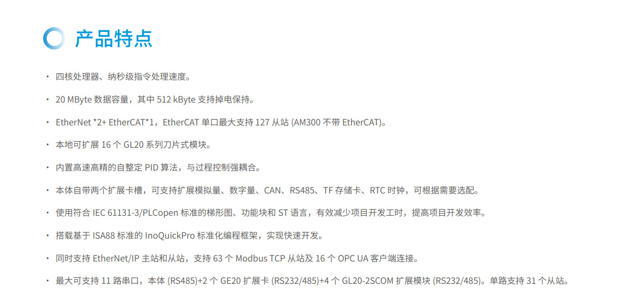 AM300系列是匯川技術推出的新一代中型PLC,其設計開發完全符合PLCopen規范和IEC-61131-3標準,支持ST,LD,SFC,CFC等編程語言,具備高性能、小體積、模塊化等優點。集成如EtherNet/IP、OPC UA、Modbus TCP(支持兩路不同網段的IP地址)、TCP/IP、RS485(最大可擴展至3路)、CAN總線等全球標準工業網絡。主要應用于暖通空調、化工印染、水處理、污水處理、熱處理等過程控制行業,同時可作為物流、汽車、日用品等單機組合產線的網絡通信站點,滿足內外網隔離、高速總線通信及數據處理的場景應用需求。